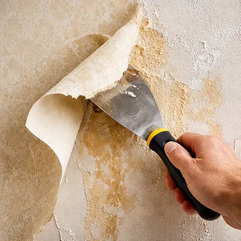 Wallpaper removal done carefully — with wall repair and preparation for a smooth, paint-ready finish.